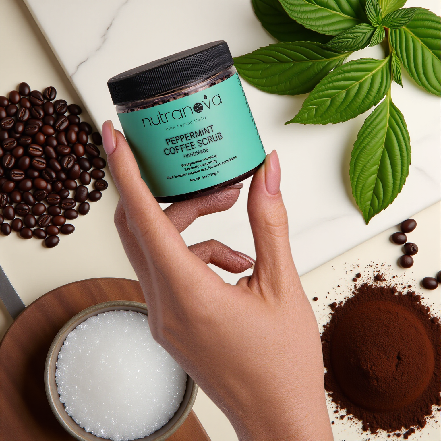 Experience the rejuvenating power of our Peppermint Coffee Scrub, designed to invigorate your skin and provide a multitude of benefits for a fresher, younger, and brighter appearance.